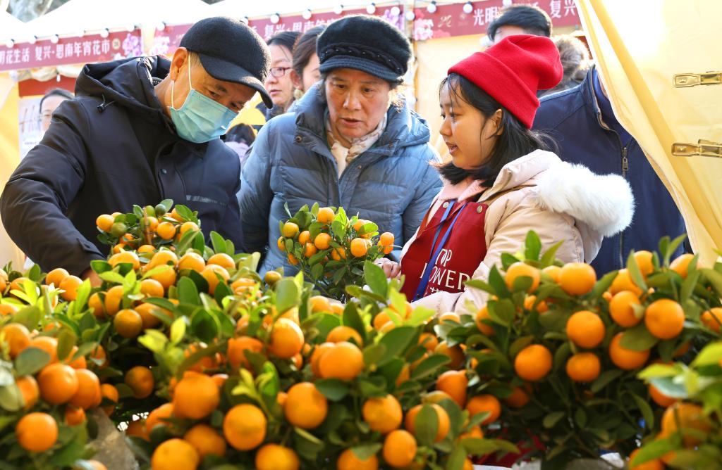 1月23日,市民游客在上海復興公園年宵花市上選購小金橘。