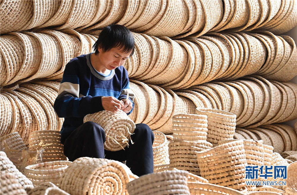 4月19日,洛南縣巧手工藝品有限公司員工在編制産品。新華網發(陳亞民 攝)