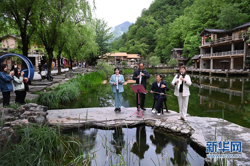 5月7日,終南山寨的居民在景區為游人演奏陜南民歌小調。