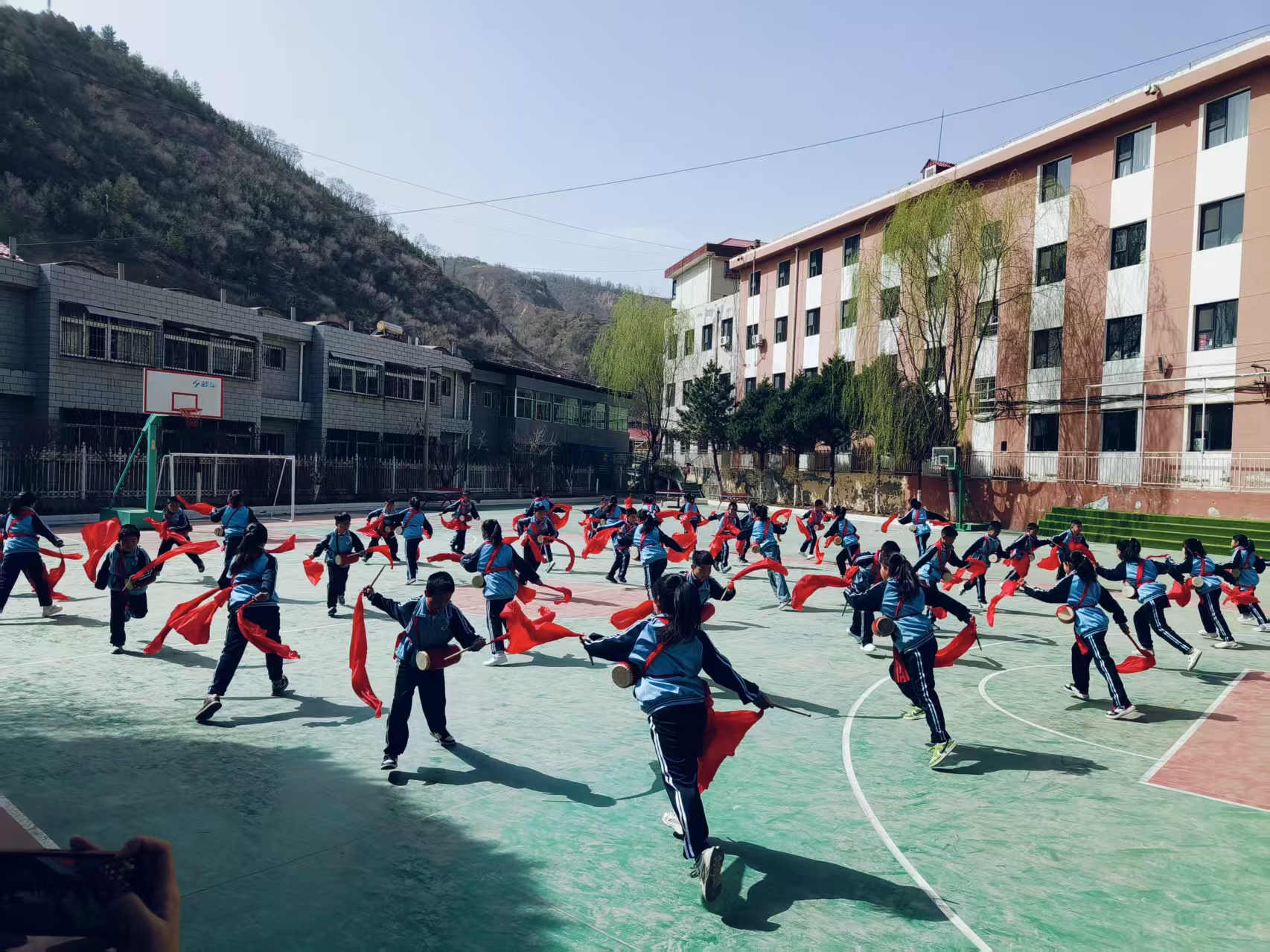 安塞腰鼓省级非遗传承人苏宏丽是安塞区第一小学的体育教师,她在操场上吹起口哨:“同学们,跳跃时注意节奏,保持身体平衡。”一声嘹亮的哨响,孩子们鼓槌挥舞、腾挪跳跃、踢腿转身、红绸飞舞,随着铿锵有力的节奏,做出整齐划一的动作。