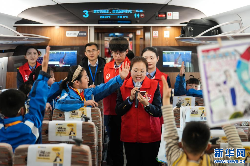 12月7日,中小学师生代表在开往西安北站的复兴号动车组列车上参加答题游戏。