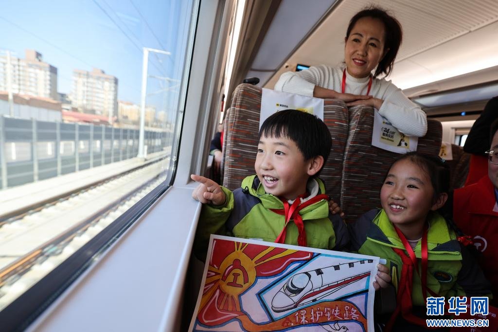 12月7日,师生代表在延安站开往西安北站的复兴号动车组列车上观赏沿途风景。
