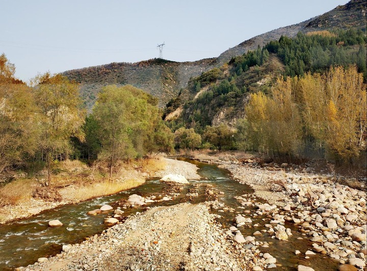 “终南之秀钟蓝田,茁其英者为辋川。”驻足在辋川镇闫家村大桥,穿桥而过的便是辋峪河,它自东南方的秦岭山中款款而来,依依向西北而去,最终汇入杨柳含烟的灞河。远处,群山逶迤,青松依旧苍翠,河岸的杨树早已通身金黄。冬日暖阳温煦而渐有寒意,河道里连片的白石正在淙淙的水流声中静享日光浴。