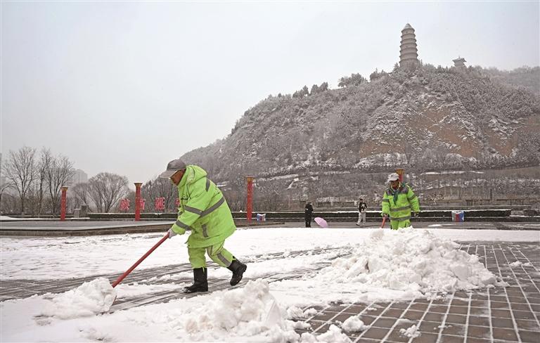 12月11日晚至12日白天,延安市迎来入冬后的第一场雪。图为环卫工人在安澜门广场清理积雪。 通讯员 王德荣摄