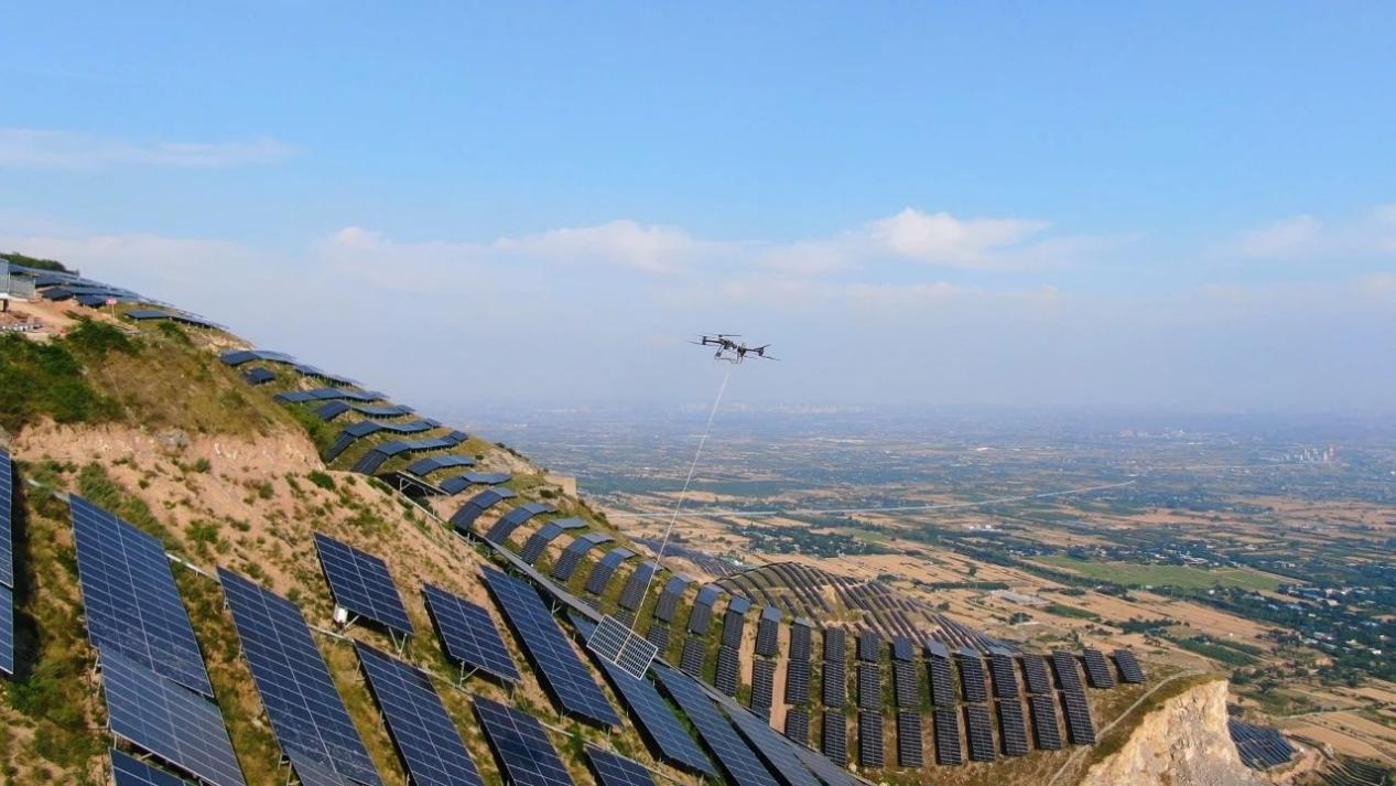华能泾阳光伏200MW+生态治理发电项目采用无人机进行材料运输。