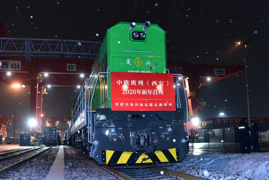 2026年1月1日凌晨,满载45个集装箱光伏组件的中欧班列(西安)2026年新年首列暨跨里海国际运输走廊班列驶出西安国际港站。此趟班列将经霍尔果斯口岸出境,跨过里海,最终抵达阿塞拜疆巴库。
