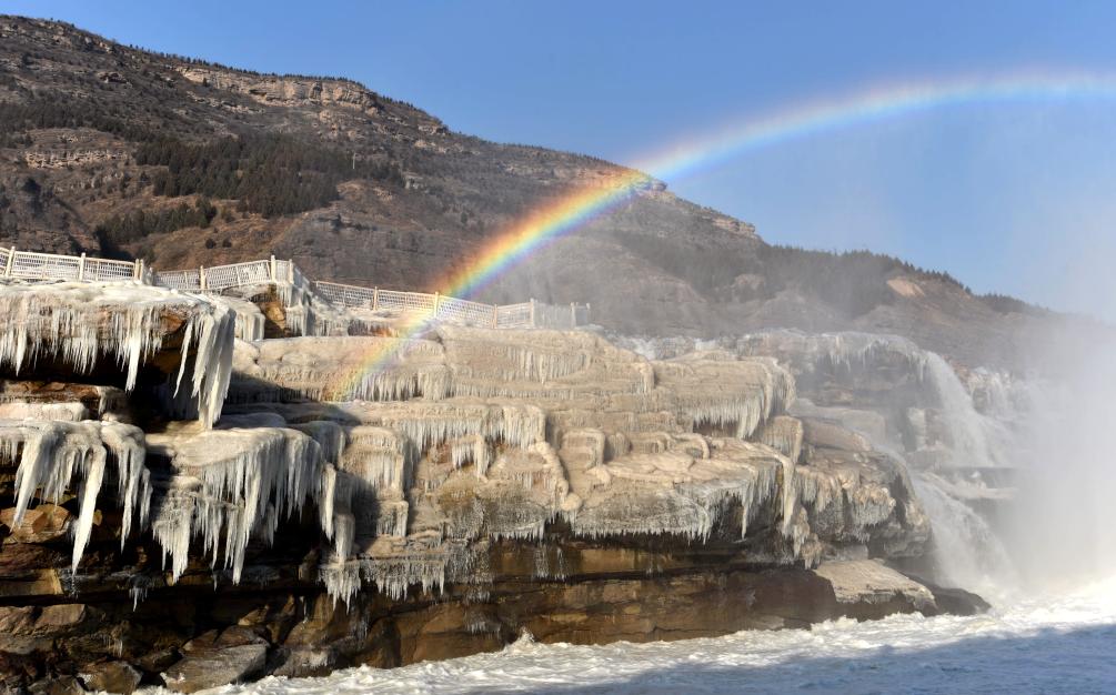 连日来,受持续降温天气影响,位于山西吉县和陕西宜川县交界的黄河壶口瀑布出现“冰瀑玉壶”景观,吸引了不少游客前来欣赏“母亲河”的冬日壮美景色。