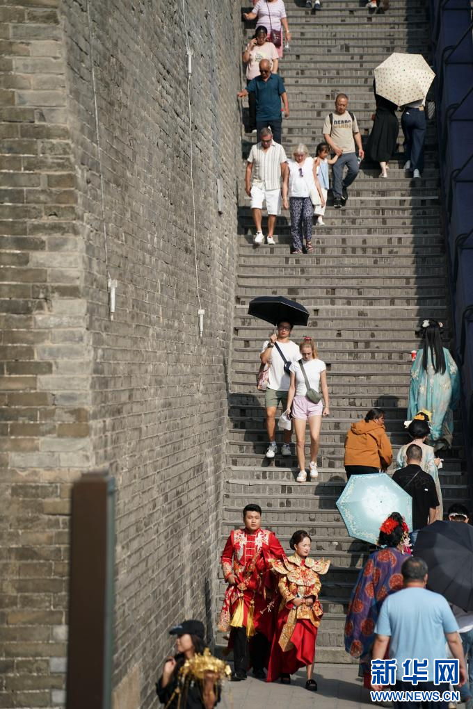 游客在西安城墙上拍摄艺术照(2025年9月12日摄)。