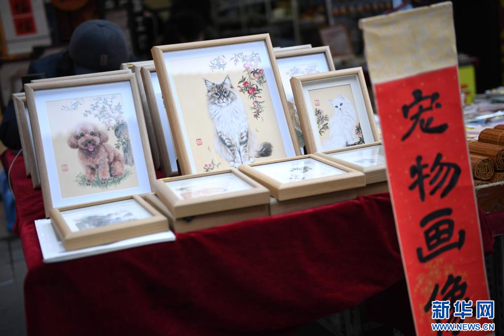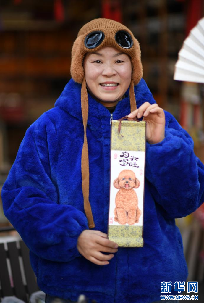 1月9日,画师陈丽华在书院门历史文化街区展示自己绘制的宠物狗画像。