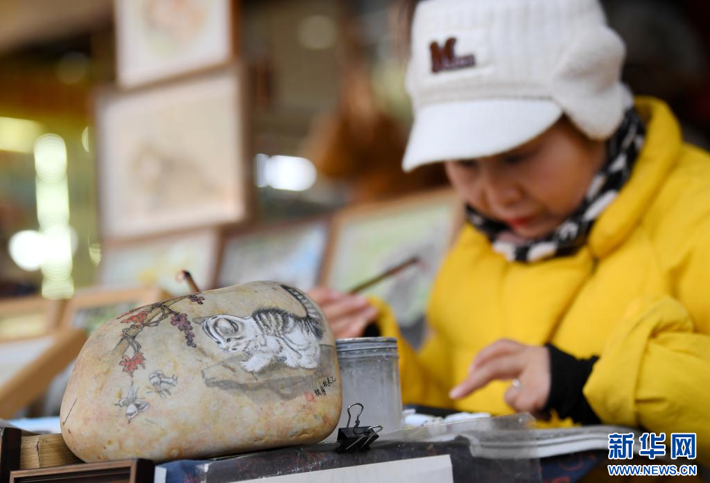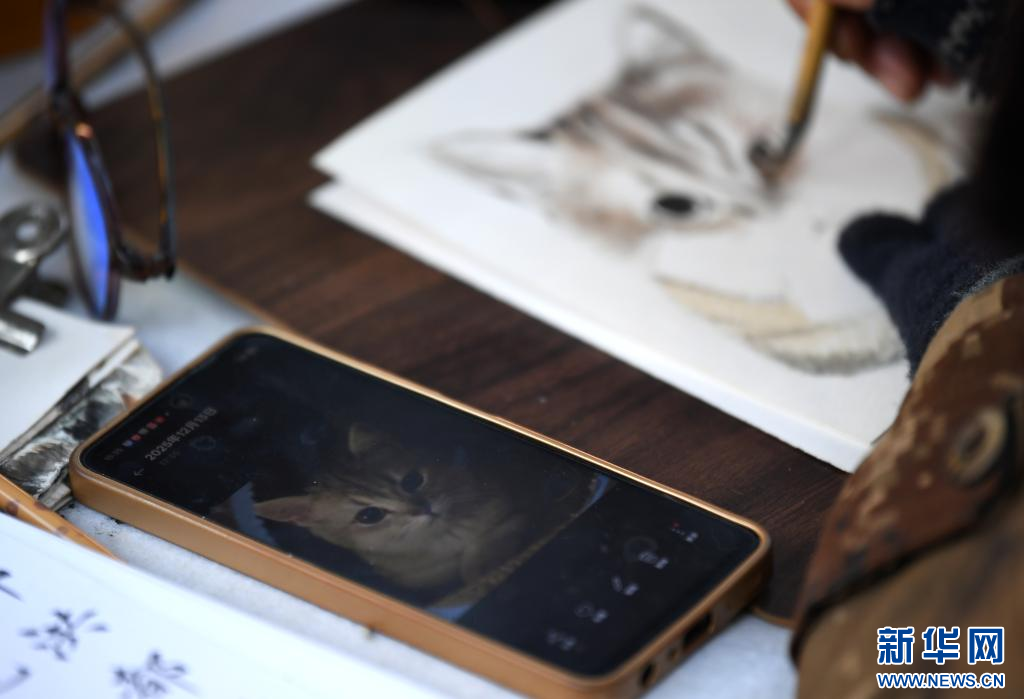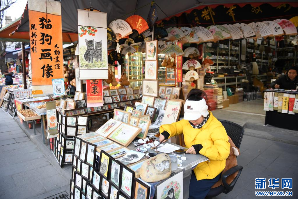 1月9日,在西安书院门历史文化街区,画师根据顾客提供的照片绘制宠物猫画像。