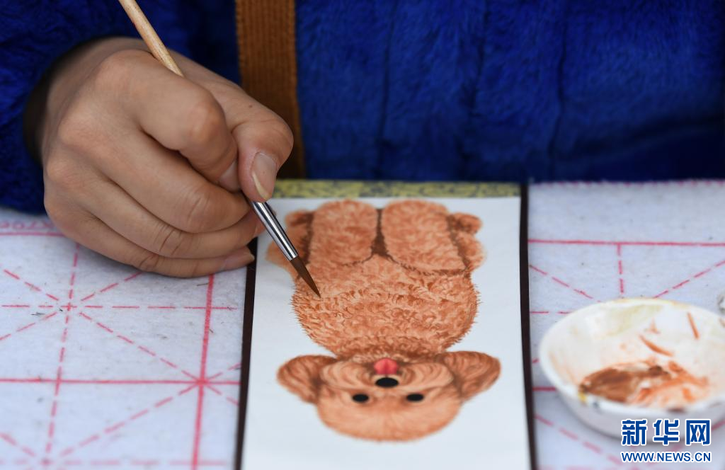 1月9日,在西安书院门历史文化街区,画师陈丽华在绘制一幅宠物狗画像。
