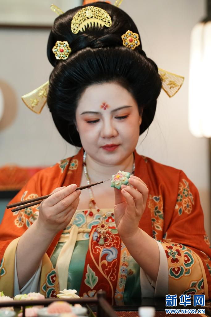 唐果子,是起源于唐代的传统特色糕点,佐茶而食,其造型精致、色彩丰富,曾在唐代宫廷贵族中流行。在西安,有着多年烘焙工作经验的“80后”李欢,一次偶然的机会与唐果子结缘。2020年,李欢与志同道合的伙伴成立公司,创立了“开元风雅”品牌,李欢也成为了品牌的主理人。她和团队埋首于唐代饮食文献之中,行走于各大博物馆内,从唐代文物的花纹图案中汲取灵感,结合健康饮食和现代口味需求精心调整配方,成功“复现”出一枚枚精巧的唐果子,受到人们的欢迎。