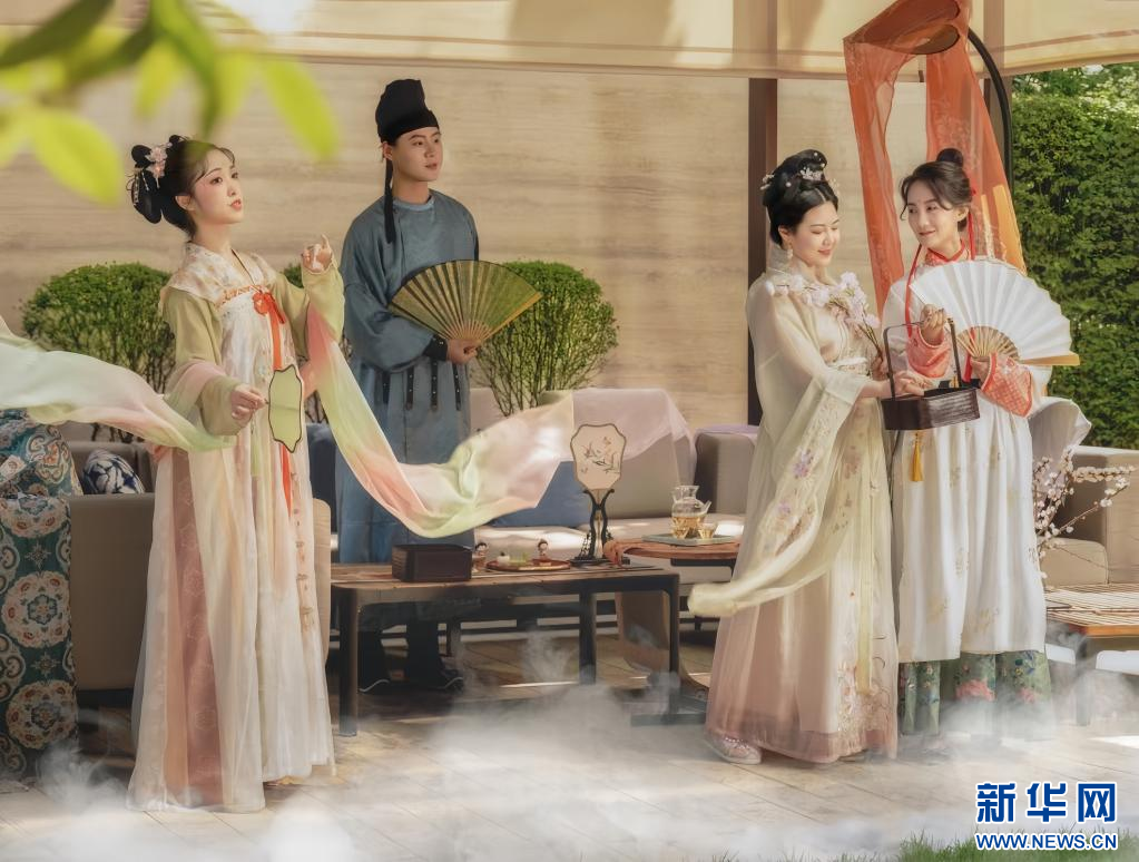 李欢(右二)组织的团队在西安市一家酒店举办唐代上巳节游春主题的品茶活动(2023年3月24日摄)。