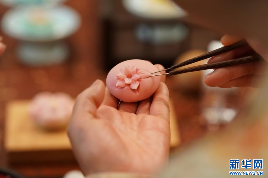 1月9日,制果师卓美艳在制作荷花造型的唐果子。