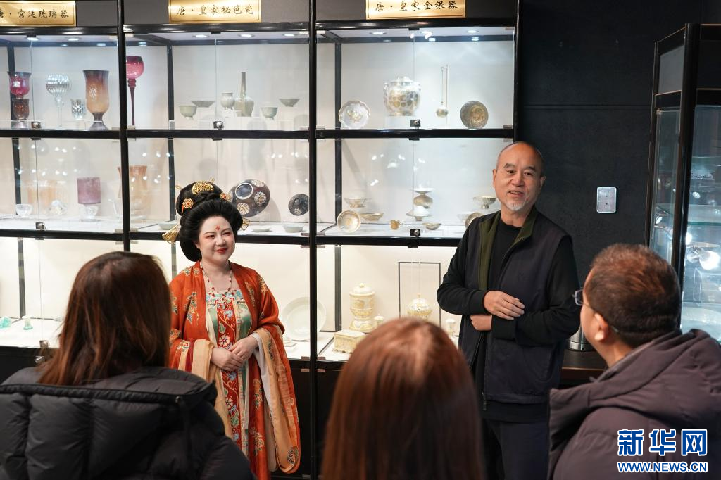 1月9日,李欢(正面左)与法门寺博物馆特邀研究员、中国国际茶文化研究会学术委员王苗(正面右)一起为游客讲解唐代茶具的种类和故事。
