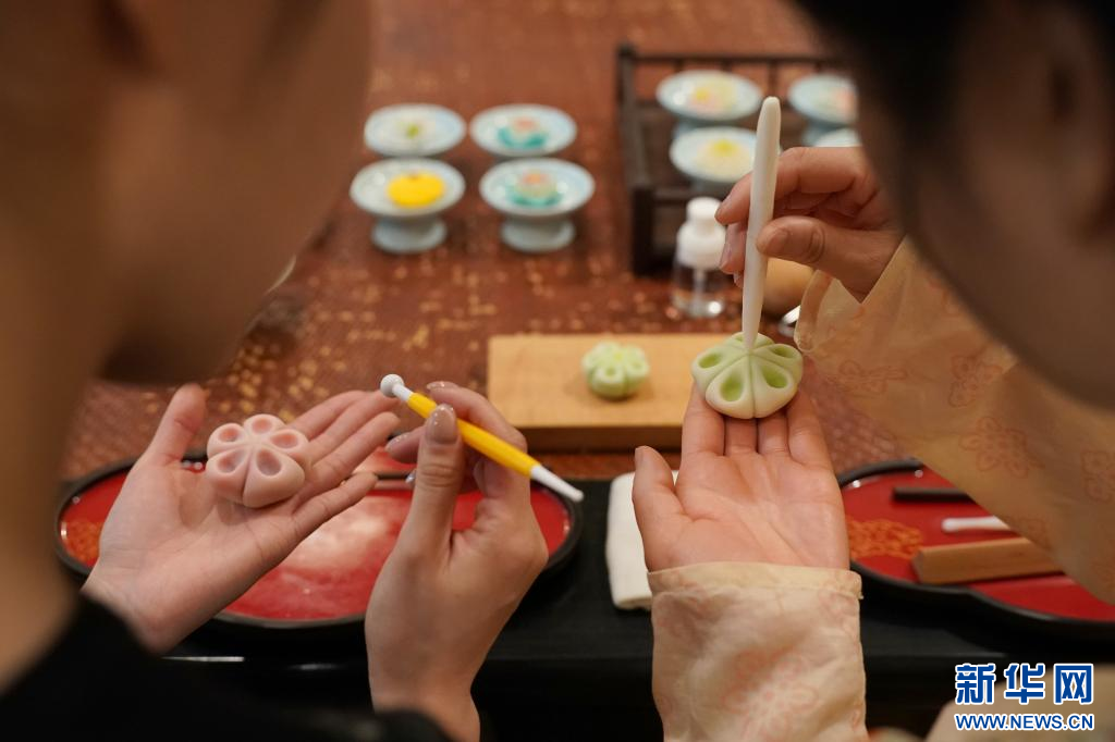 1月9日,一名爱好者在李欢的唐果子制作体验项目中跟着制果师学习制作唐果子。