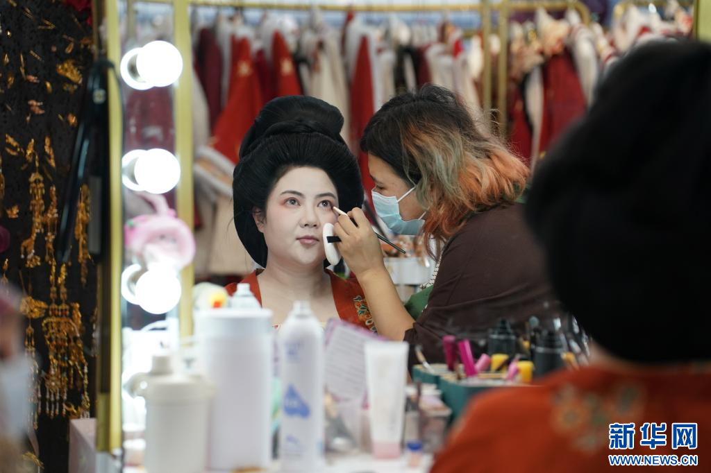 1月9日,李欢在进行唐果子制作体验项目前化唐妆。