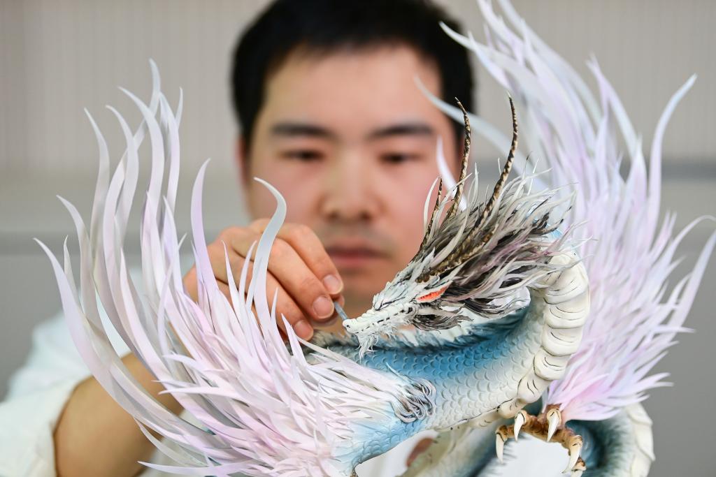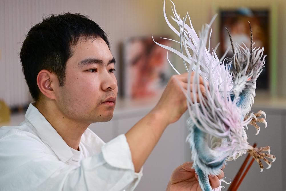 糖艺师张勃在制作糖艺作品《山海经应龙》(1月13日摄)。
