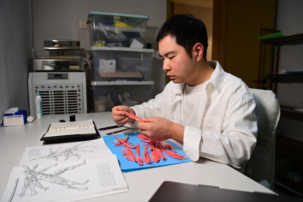 “我从日常生活中最熟悉的食材开始琢磨,从超市买回鸡翅后多次解剖,仔细观察肌肉纹理和骨骼构造,让糖不仅能塑造出惟妙惟肖的外形,也能还原内部的精巧构造。”张勃说,为了在视觉上实现“高度仿真”效果,他自学了生物学、解剖学、雕塑、喷绘等专业知识,在创作前反复调试糖料的硬度与色彩,让科学观察与艺术想象彼此交融。