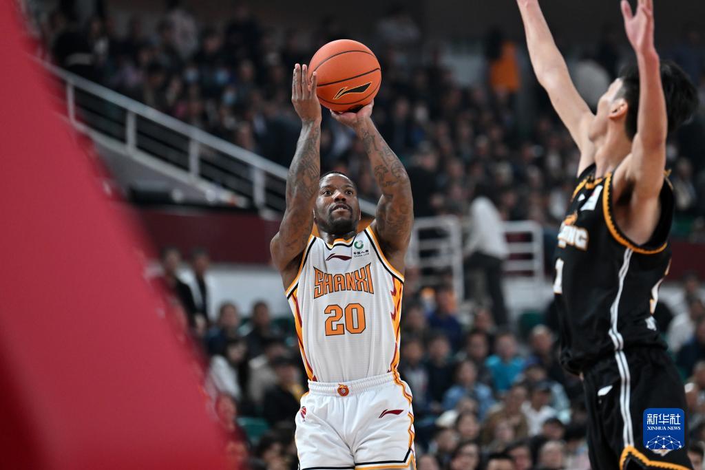 3月30日,山西汾酒股份隊球員費爾德(左)在比賽中投籃。
