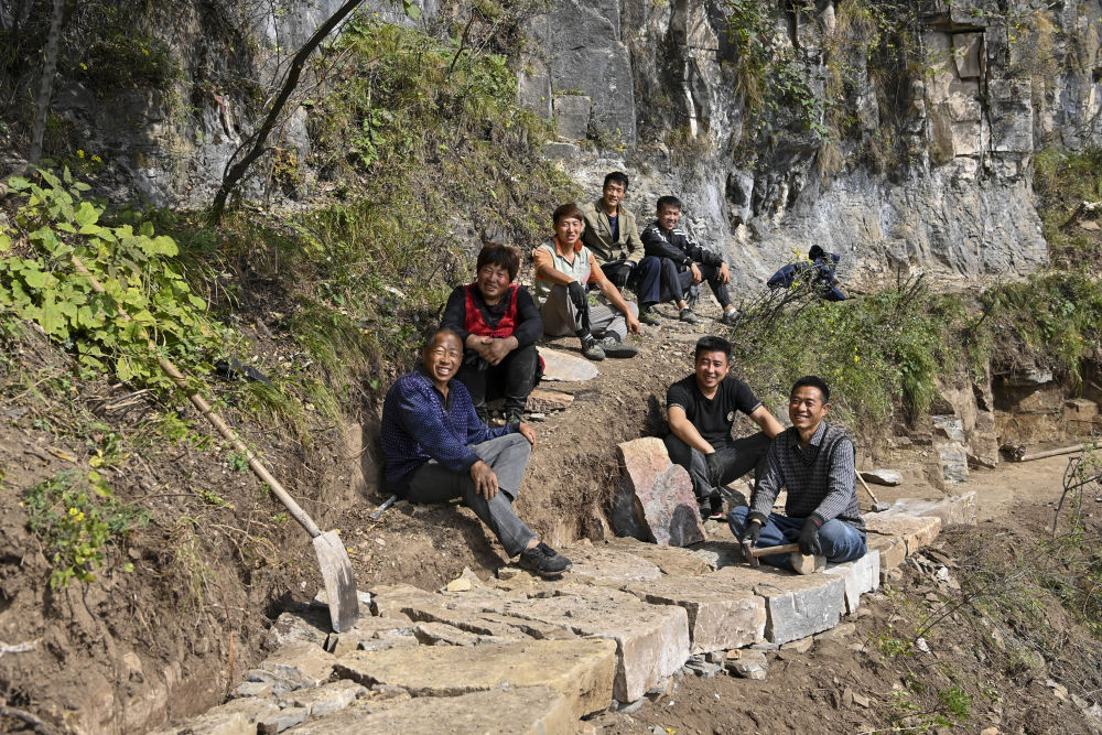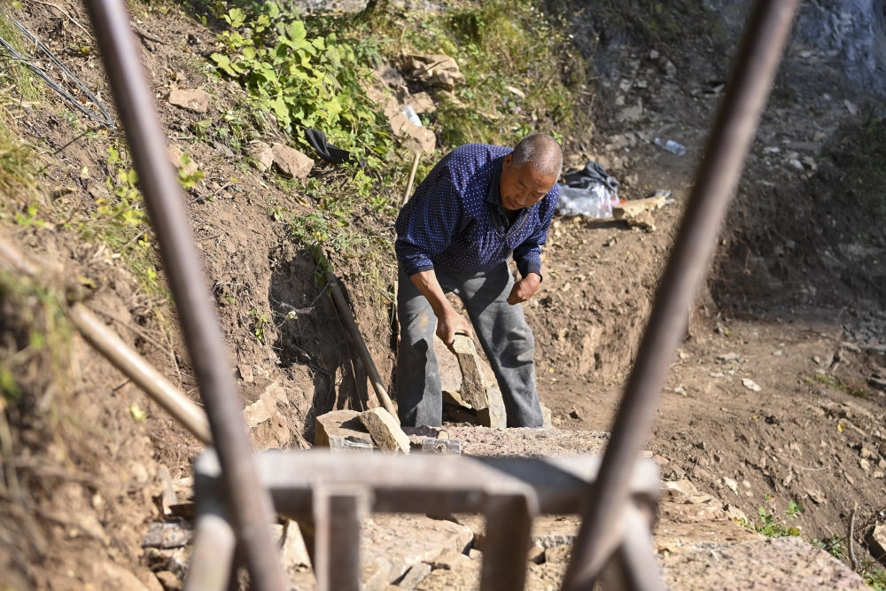 村民在山路上填補石縫(10月17日攝)。新華社記者 楊晨光 攝