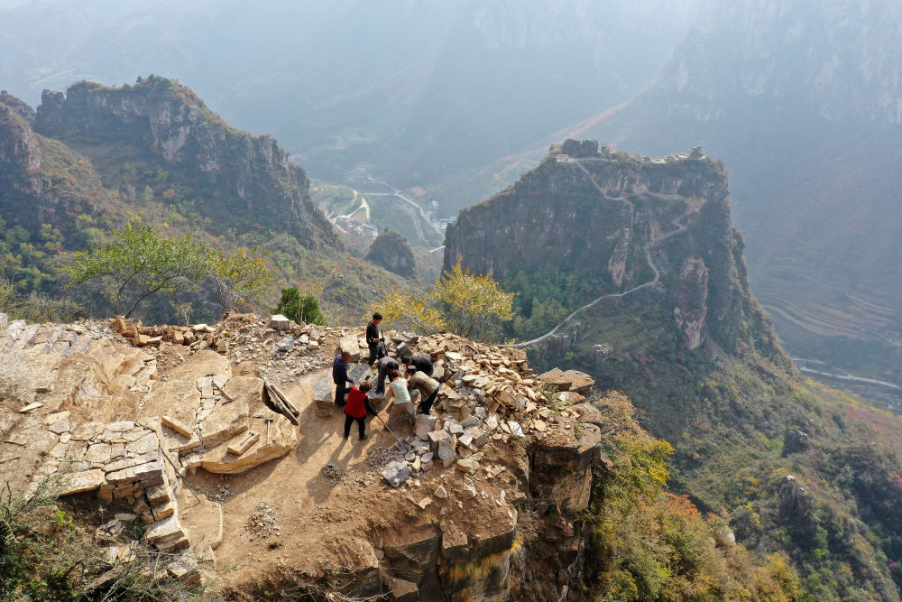 在壺關縣大峽谷鎮青龍峽村,牛何松(左)和村民們在山間搬運石塊(10月17日攝)。新華社記者 楊晨光 攝