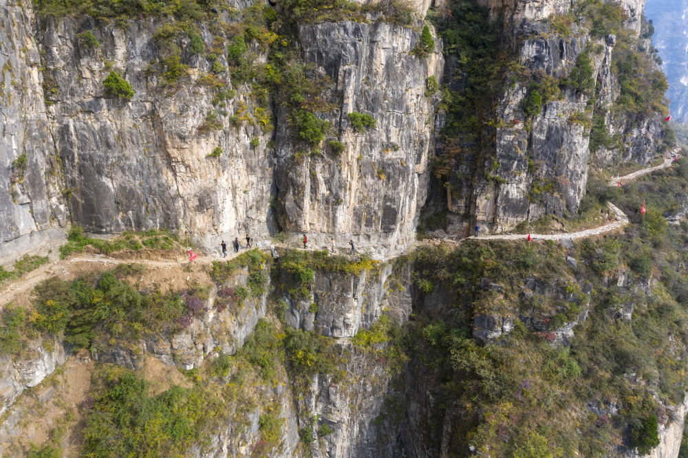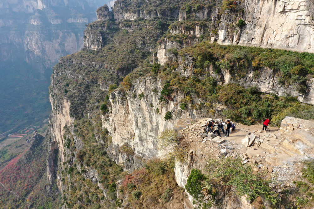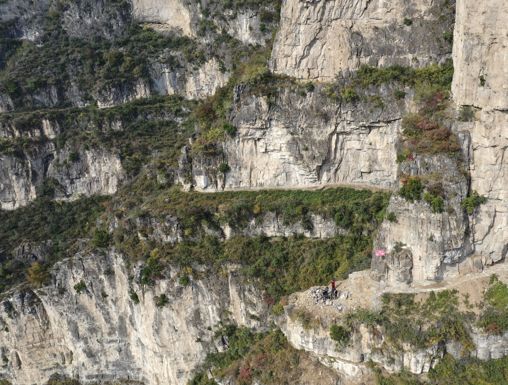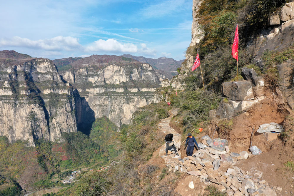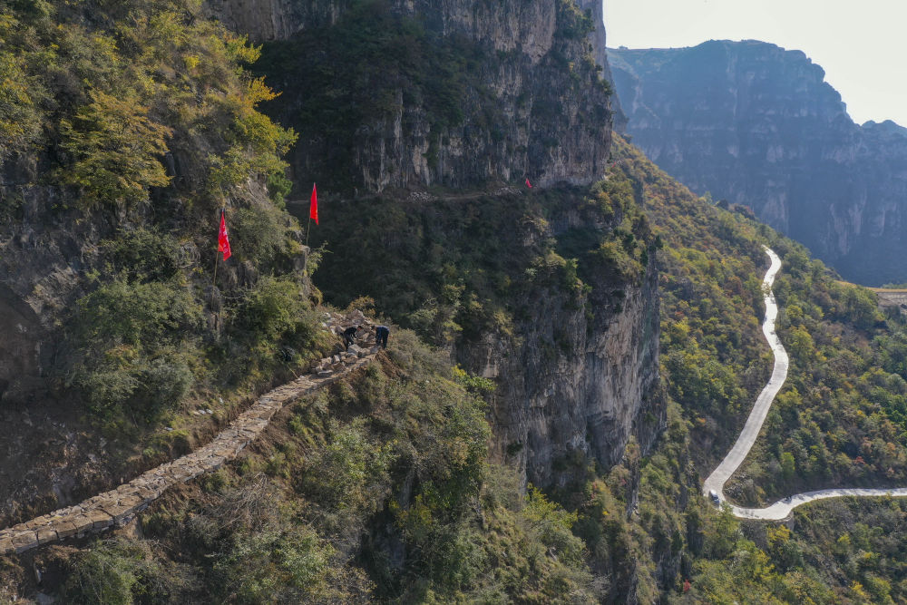 在壺關縣大峽谷鎮青龍峽村,修路的村民在太行山上行走(10月17日攝,無人機照片)。新華社記者 楊晨光 攝