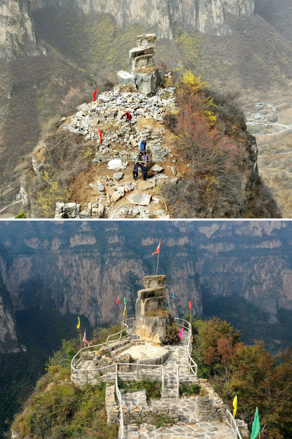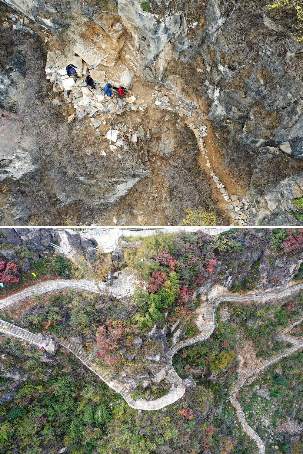 拼版照片:上圖為在壺關縣大峽谷鎮青龍峽村,村民們在山上修路(3月23日攝,無人機照片);下圖為修好的旅游步道(10月18日攝,無人機照片)。新華社記者 詹彥 攝
