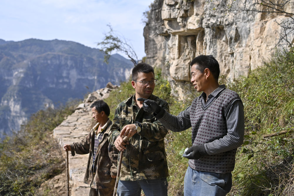 牛何松(右)向經過的村民們描繪修通絕壁棧道帶來的觀光體驗(10月17日攝)。新華社記者 楊晨光 攝