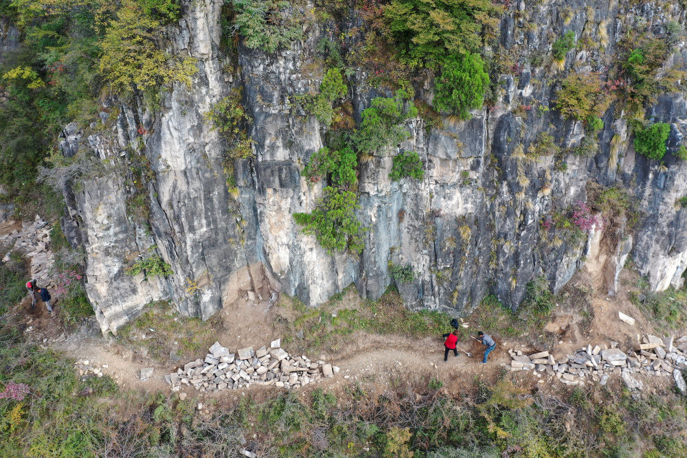 在壺關縣大峽谷鎮青龍峽村,村民們在山上修路(10月17日攝,無人機照片)。新華社記者 詹彥 攝