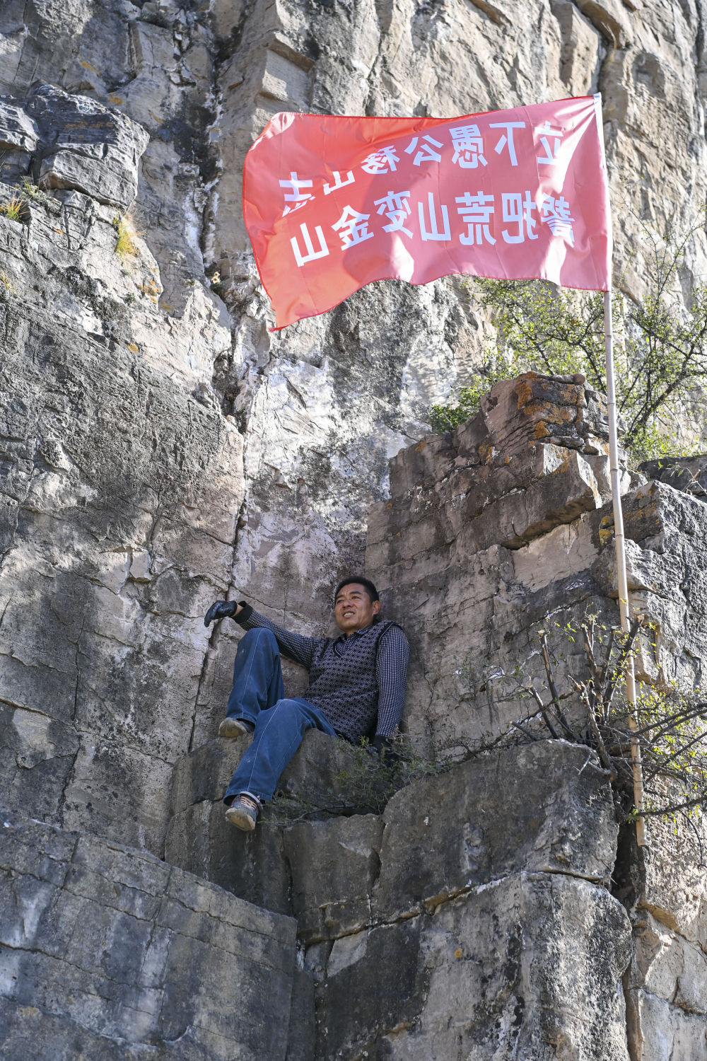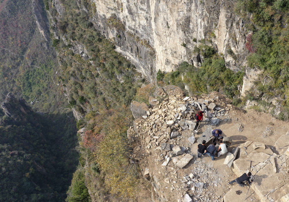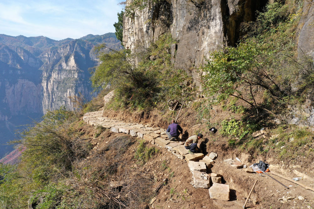 “絕壁棧道”路如其名,需要在筆直如刀削的懸崖峭壁間鋪設一條1米多寬的石板路。劈山、取石、肩抬、手抱……十余名村民克服陡峭的地形和艱苦的運輸條件,向千古未變的太行山“開戰”,用親手壘築的一塊塊石頭,向大山述説追求美好生活的心願。