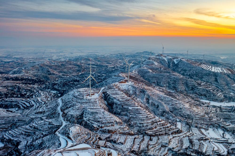 運城市萬榮縣境內拍攝的風力發電機組。