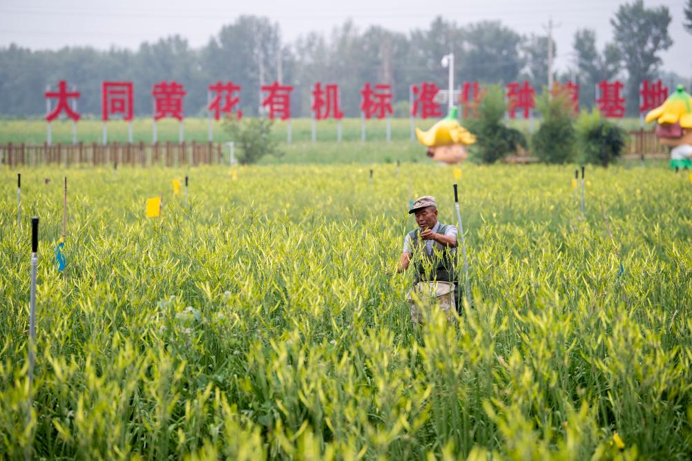村民在位於雲州區唐家堡村的大同黃花有機標準化種植基地內採摘黃花。