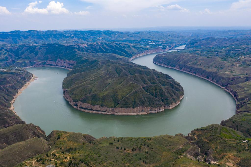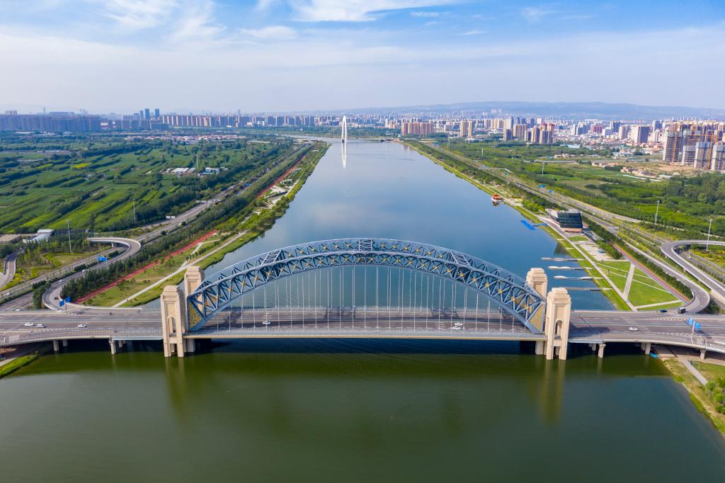 航拍汾河景色。