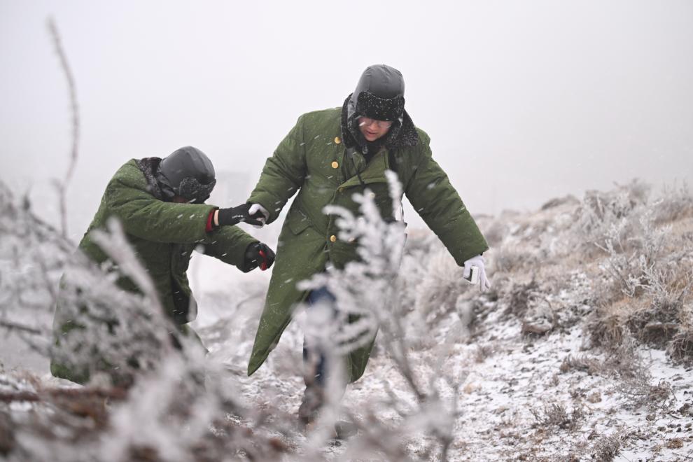 巡線路上,楊嘯(右)拉着搭檔李均平登上一處陡坡(1月24日攝)。