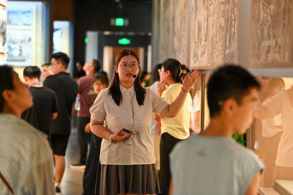 甄睿(右一)在八路軍太行紀念館為游客講解(8月7日攝)。