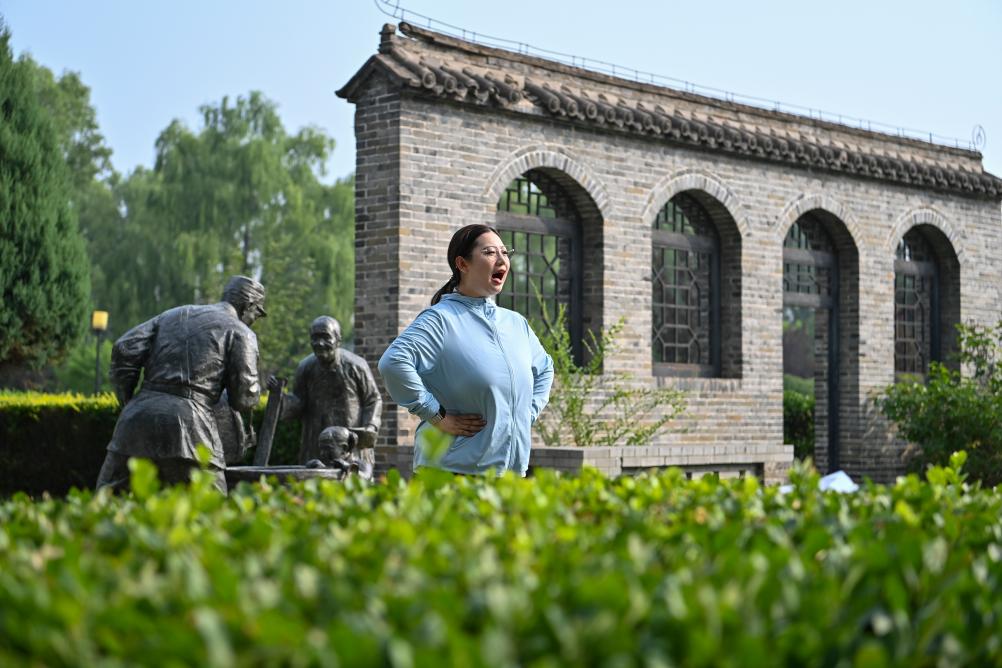 開始一天的工作前,甄睿在八路軍太行紀念館練聲。她説,此舉對長時間講解很有幫助(8月8日攝)。
