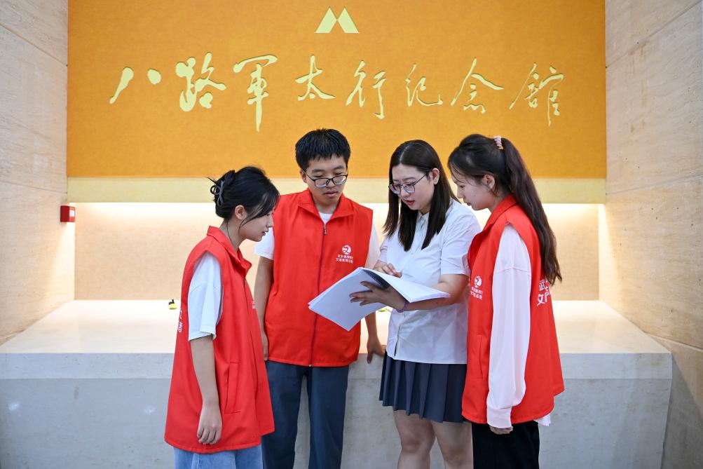 在八路軍太行紀念館,甄睿(右二)結束一天的講解工作後,和志願者們共同查看觀眾留言反饋(8月7日攝)。