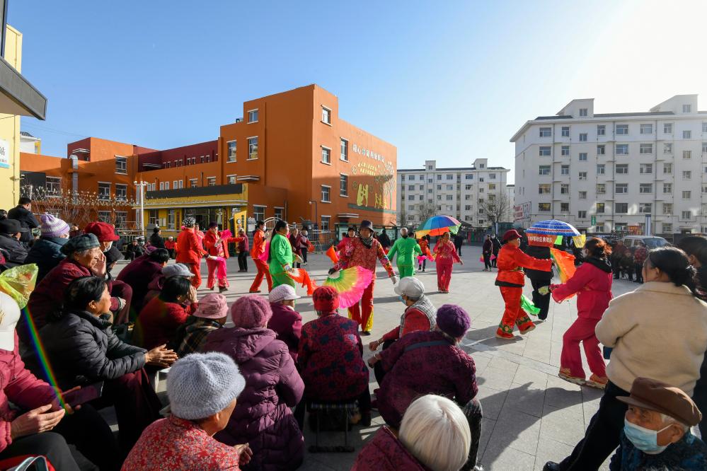 初冬的呂梁山,寒風凜冽。山西省呂梁市臨縣湫水柏林苑易地扶貧搬遷安置點內,孩子們有説有笑趕去上學,老人們在小區廣場跳舞健身,扶貧車間裏人們辛勤勞作,一派熱鬧景象。(新華社記者詹彥)