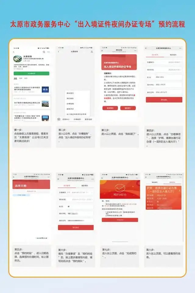 有&&境辦證需求、無法在工作日時間前往辦理的市民,可以提前預約夜間辦證服務,微信搜索“太原政務”微信公眾號,關注後在下方點擊“辦事服務”選擇“&&境夜間辦證專場”模塊,在線預約成功後前往大廳排號辦理。