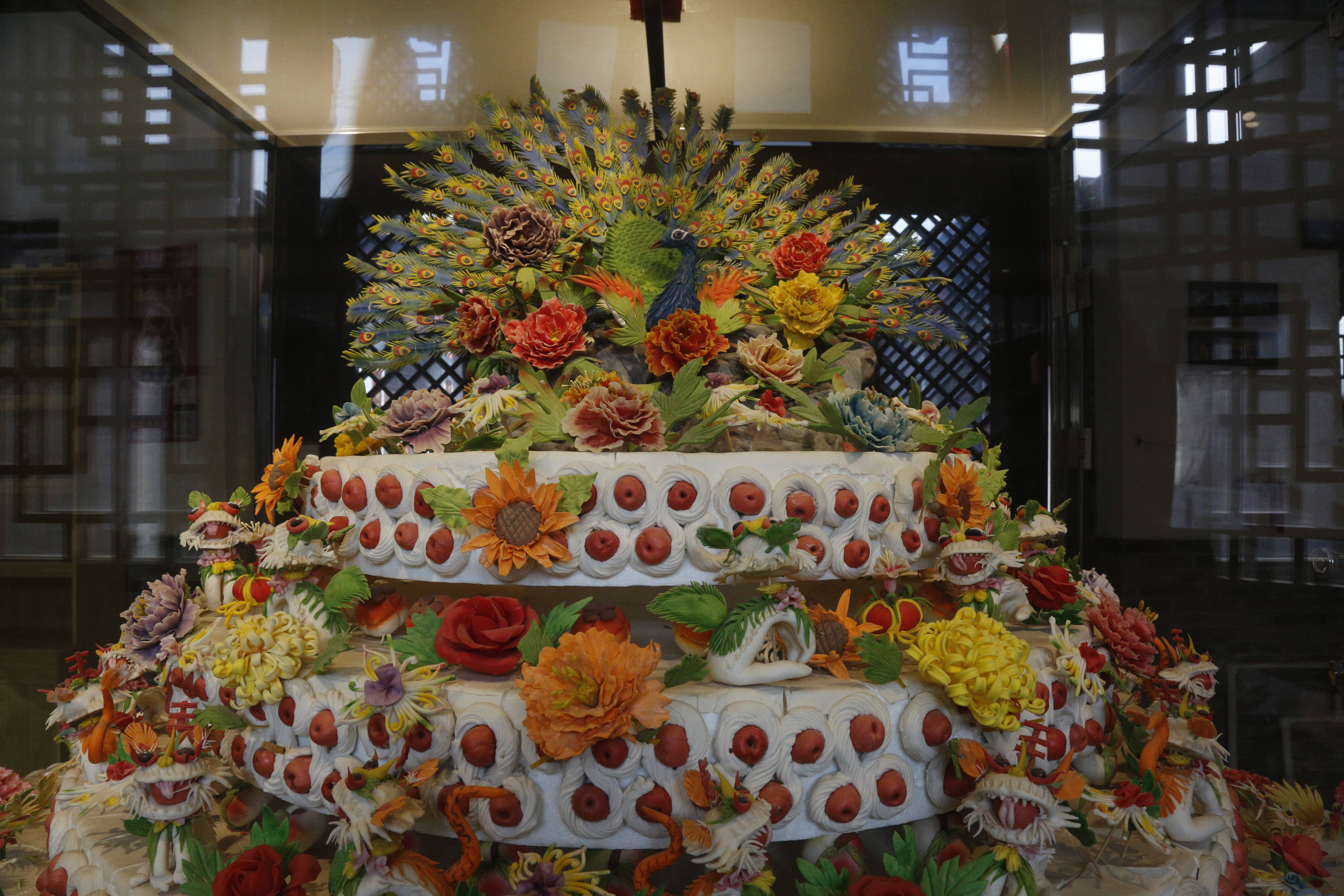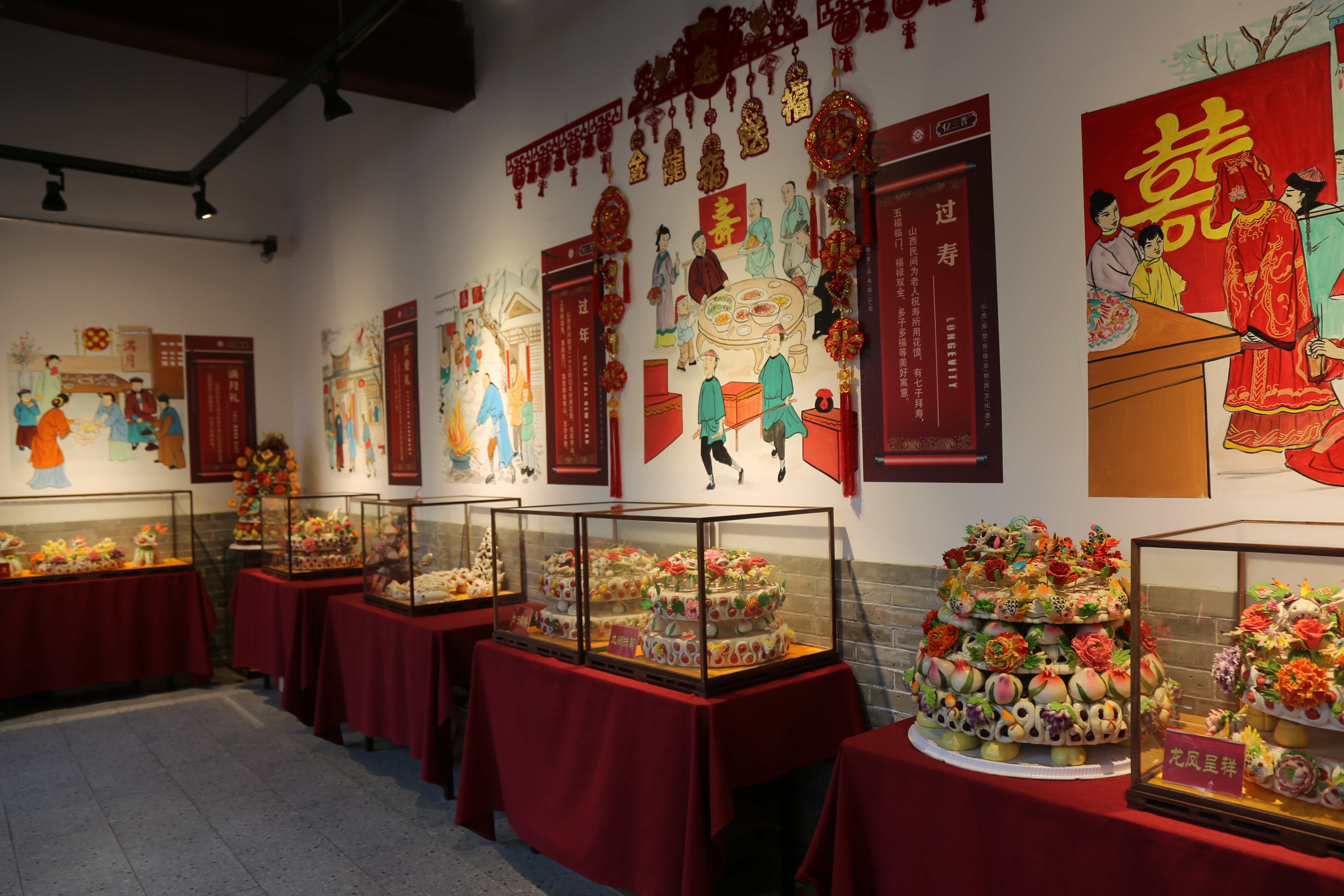 6月24日,在太原古縣城一家花饃店舖內,透明的玻璃櫃內陳列着各式各樣好看的花饃。吉祥喜慶的壽桃、活靈活現的飛龍、絢麗繽紛的玫瑰……造型多樣、色彩艷麗。