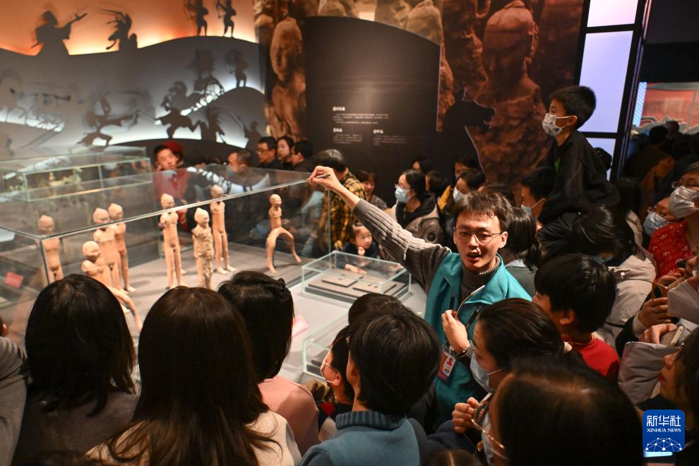 2025年1月1日,講解員在天津博物館“天開一統——秦漢文物主題展”上為觀眾講解。新華社記者 孫凡越 攝