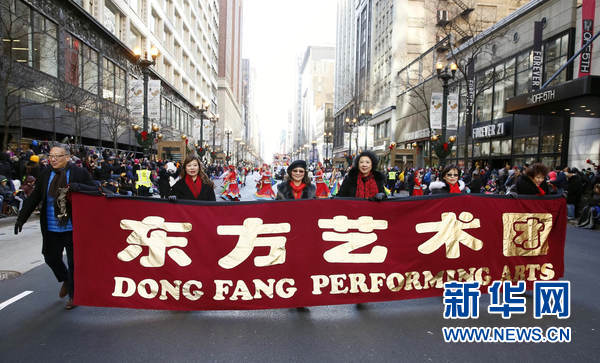 來自芝加哥東方藝術團的演員參加感恩節大游行。當地時間11月23日,第84屆芝加哥感恩節大游行在芝加哥市中心的州街(State Street)如期舉行,有40余萬市民在現場觀看了這一活動。今年感恩節大游行共有100多個游行方陣總計5000多名錶演者參加,其中包括以芝加哥東方藝術團、印城華夏文化中心舞龍和舞蹈隊為代表的華人團體,參加大游行的華人藝術團體向民眾展示帶有中華元素的表演,迎來沿途觀眾的不斷喝彩。新華網記者汪平 攝