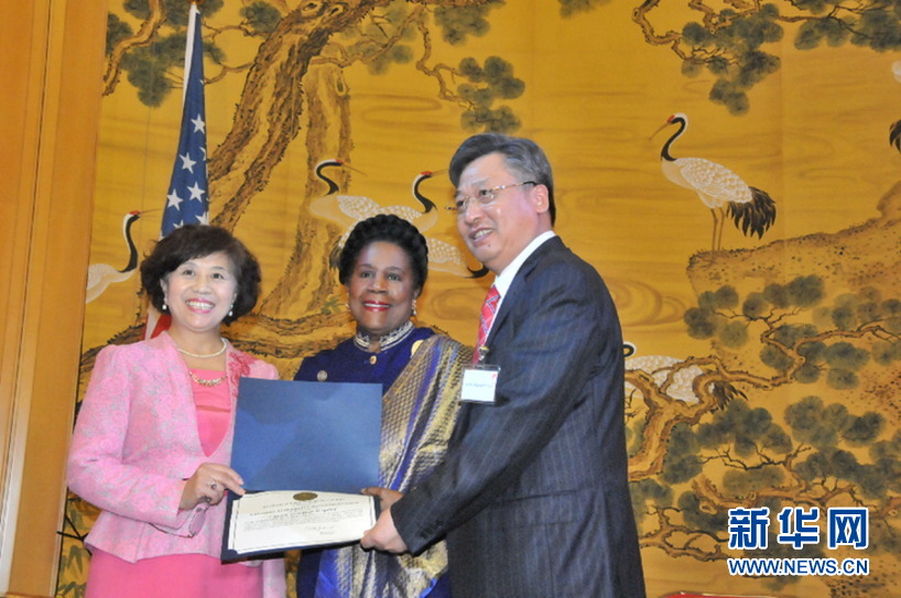 1月26日,美國得州休斯敦,美國聯邦眾議員希拉·傑克遜·李(中)向中國駐休斯敦總領事李強民和夫人曾紅燕呈交賀信。當天傍晚,李強民總領事在官邸舉辦“來自春天的問候”中國民樂音樂會,慶祝即將到來的新春佳節。新華網發 (劉立偉攝)