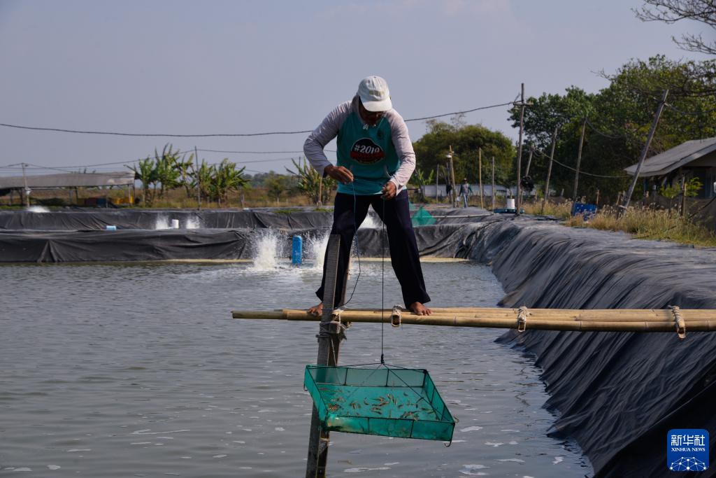 8月28日,在印度尼西亞中爪哇省三寶壟市佩馬朗區,工人在一處南美白對蝦養殖場查看蝦的長勢。新華社記者 徐欽 攝