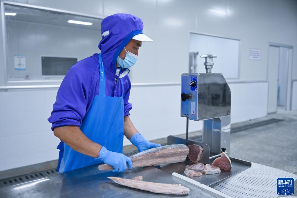 8月24日,在福建省福清市元洪國際食品産業園,工人在福建淼天匯食品有限公司的海魚加工生産線上切割金槍魚。新華社記者 周義 攝