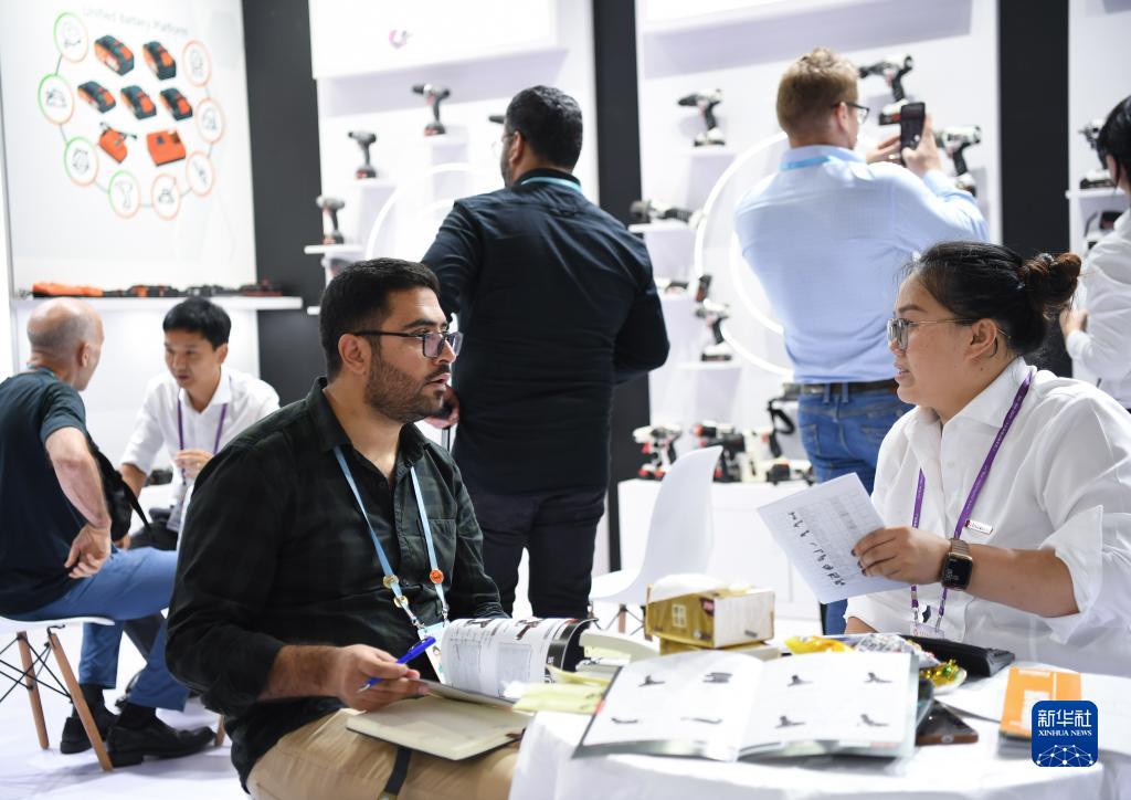10月15日,在一家電動工具展&,外國採購商在洽談業務。新華社記者 鄧華 攝