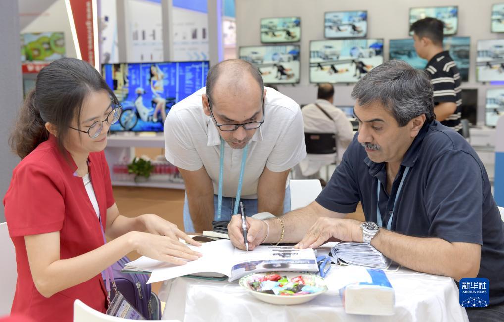 10月15日,參觀者在了解一家美國參展商的産品。新華社記者 鄧華 攝