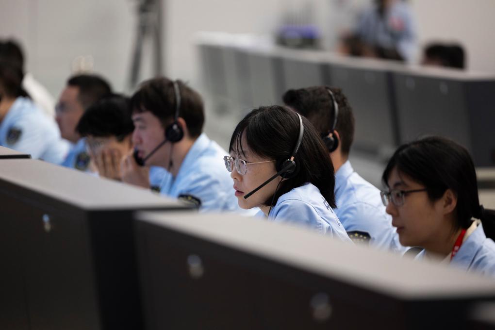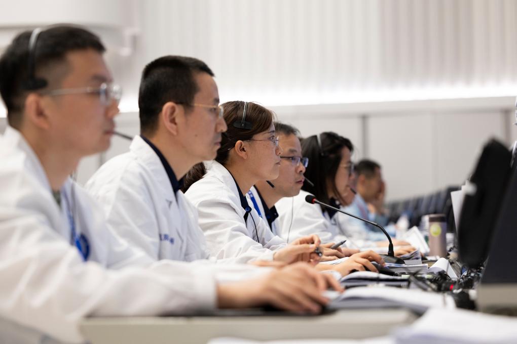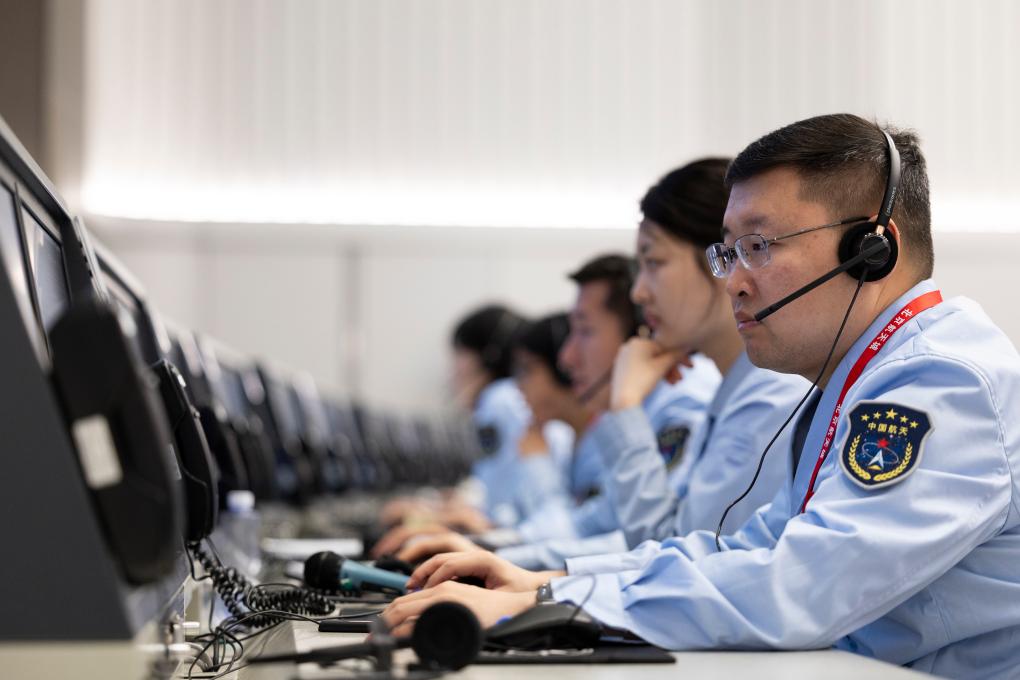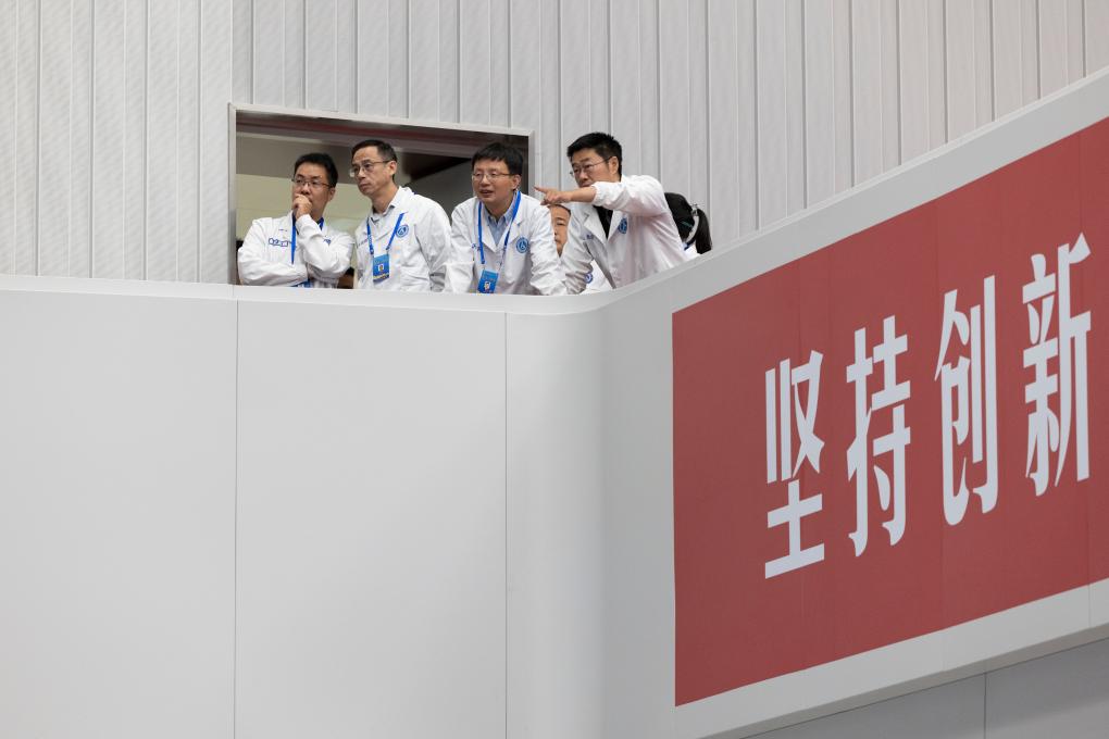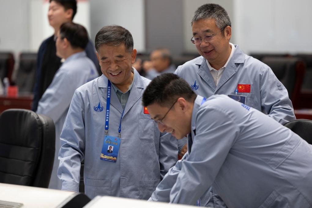 6月4日,在北京航天飛行控制中心,嫦娥六號任務總設計師胡浩(左)、長征五號運載火箭總設計師李東和嫦娥六號任務副總設計師王琼(前)交流嫦娥六號任務進展情況。