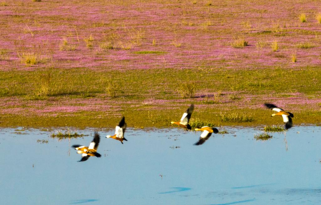 這是在江西鄱陽湖都昌濕地拍攝的蓼子花海(無人機照片)。新華社發